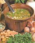 Die rohen Kartoffeln werden geschält, gewürfelt und mit Salz und Kümmel weichgekocht. Anschließend werden die Knoblauchzehen gerieben, mit Salz abgeschmeckt. Das Brot wird in kleine Würfel geschnitten und im Schmalz braun geröstet. Dann kommt der böhmische Trick: Das Röstbrot und der geriebene Knoblauch werden in die Teller gelegt und mit der Brühe übergossen.